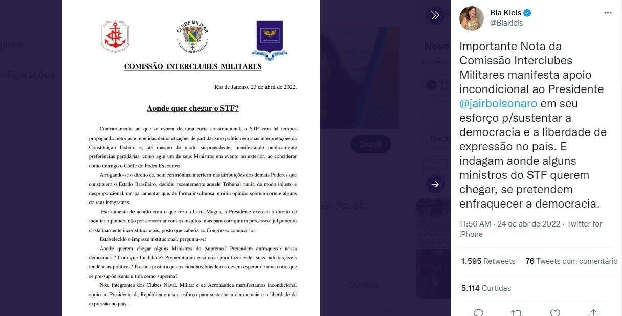 O documento está sendo repercutido por bolsonaristas nas redes sociais. A deputada federal Bia Kicis (PL-DF) foi uma das que compartilhou a publicação com os seus seguidores.