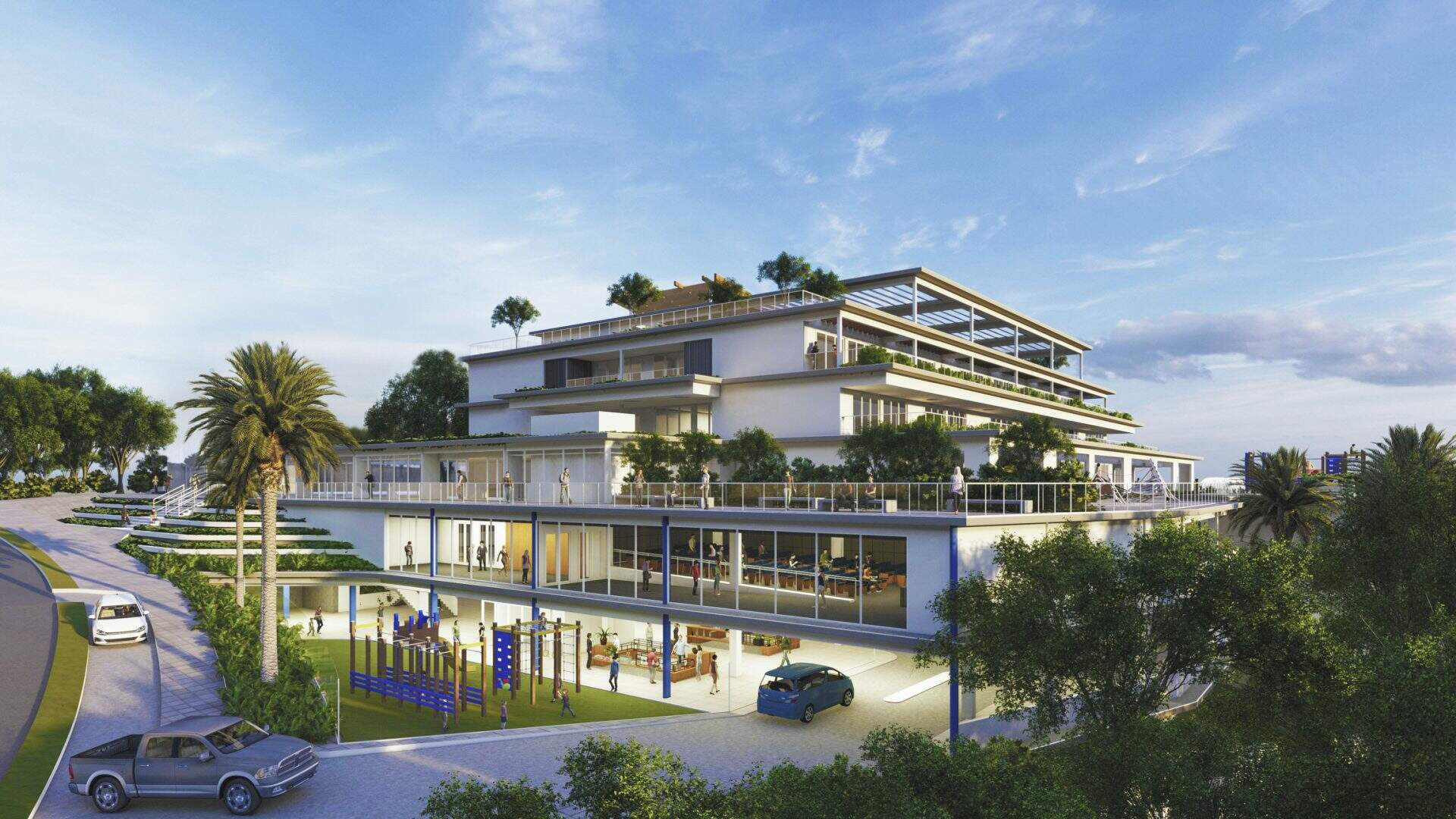 São três pavimentos de sala de aula, um terraço e mais três andares de estacionamento. Cada uma das 22 salas de aula possui piso aquecido, uma varanda com deck e um gramado particular.