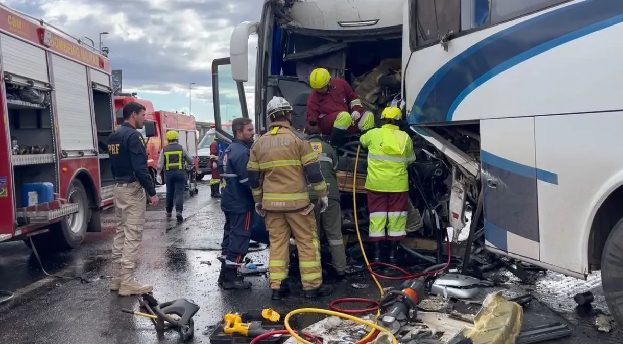 Uma colisão envolvendo dois ônibus e uma caminhonete deixou 12 pessoas feridas, no KM 94 da BR-290, a Freeway, em Porto Alegre, no Rio Grande do Sul. O acidente aconteceu no final da manhã desta terça-feira (16).