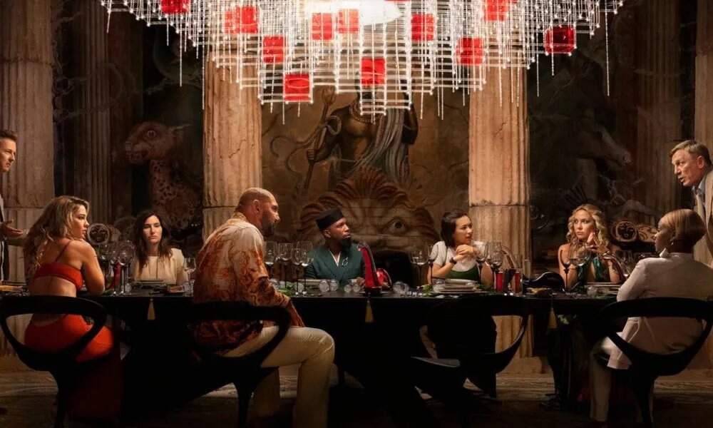 É uma turma heterogênea, digamos, formada por Claire Debella (Kathryn Hahn), governadora de Connecticut e candidata ao Senado, pelo cientista Lionel Toussaint (Leslie Odom Jr.), que trabalha para a Alpha de Bron, a ex-modelo Birdie Jay (Kate Hudson), o influencer de extrema direita Duke Cody (Dave Bautista) e Cassandra Brand, a Andi (Janelle Monáe), que fundou a companhia com Bron e foi colocada de escanteio. Também há as agregadas Whiskey (Madelyn Cline), namorada de Cody, e Peg (Jessica Henwick), assistente que tenta fazer com que Birdie não seja cancelada pelas coisas absurdas que diz e posta.
