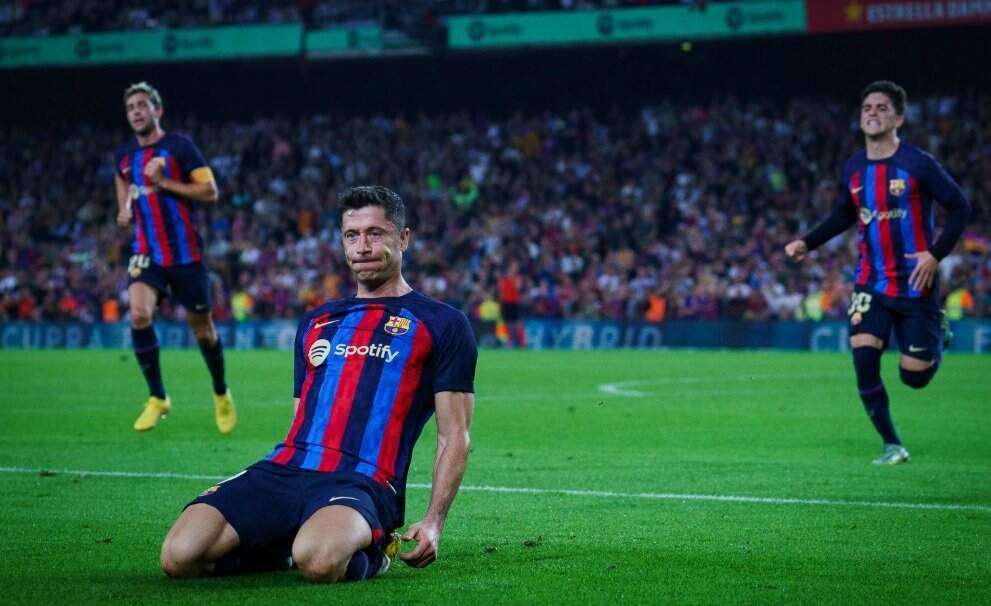 O primeiro gol do Barcelona saiu aos 31 minutos do primeiro tempo, com Robert Lewandowski. Pedri lançou Jordi Alba em profundidade pela esquerda e o lateral cruzou de forma rasteira para o atacante polonês, que tirou dois zagueiros adversários com seu domínio e finalizou sem grandes problemas para o fundo das redes.