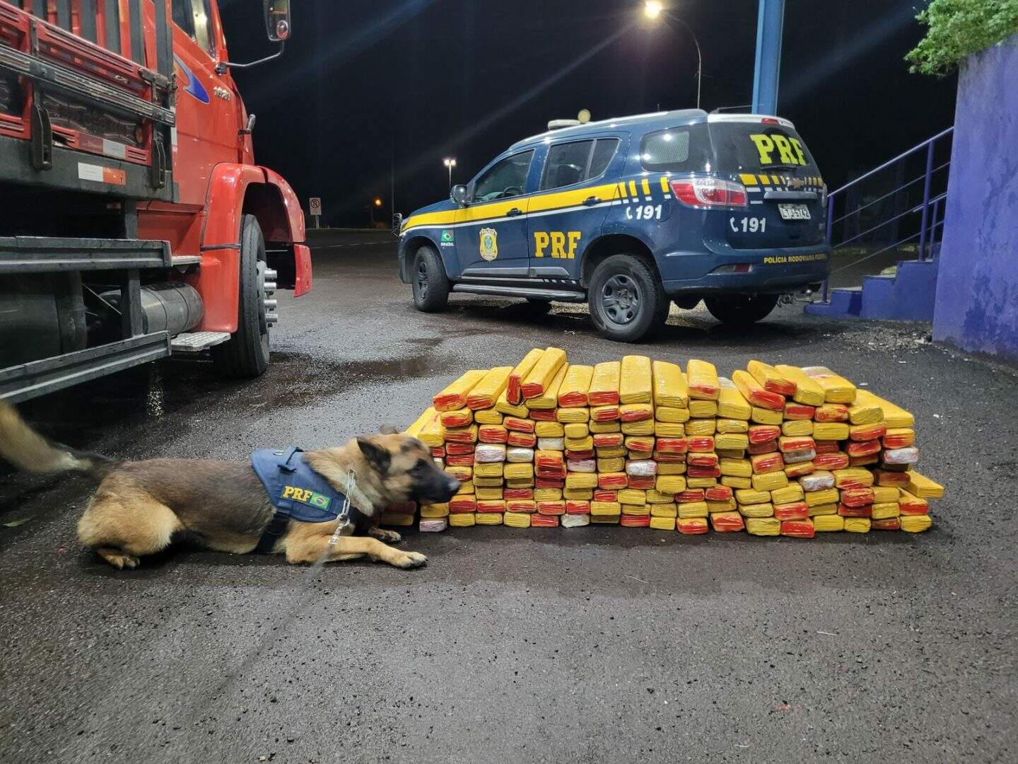 A droga estava escondida no fundo falso de um caminhão que vinha de Santa Catarina. A maconha, dividida em 167 tabletes, foi encontrada com a ajuda dos cães farejadores Cliff, Guri e Jack.