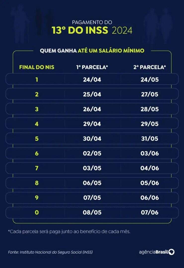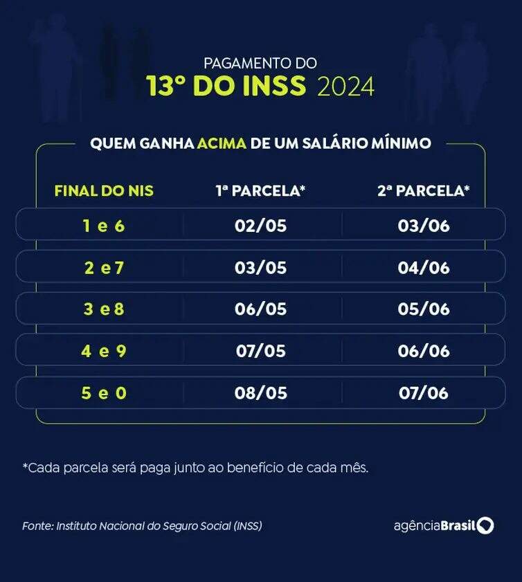 Os aposentados e pensionistas do INSS (Instituto Nacional do Seguro Social) que ganham mais de um salário mínimo começaram a receber nesta segunda-feira (3) a segunda parcela do 13º salário. O pagamento prossegue até sexta-feira (7), conforme o dígito final do NIS (Número de Inscrição Social).