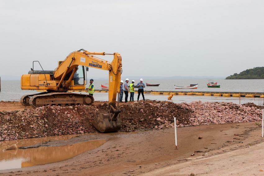 Neste momento está sendo implantada na margem do lago Guaíba uma “ensecadeira”, com o intuito de criar uma barreira provisória para água do lago, permitindo que a obra avance com segurança em solo seco.