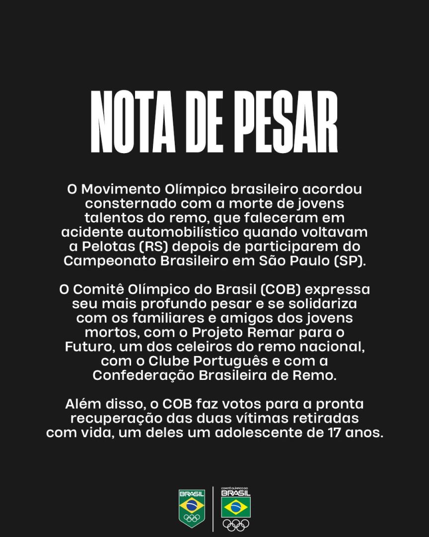 O COB [Comitê Olímpico do Brasil] expressa seu mais profundo pesar e se solidariza com os familiares e amigos dos jovens mortos, com o Projeto Remar para o Futuro, um dos celeiros do remo nacional, com o Clube Português e com a Confederação Brasileira de Remo.