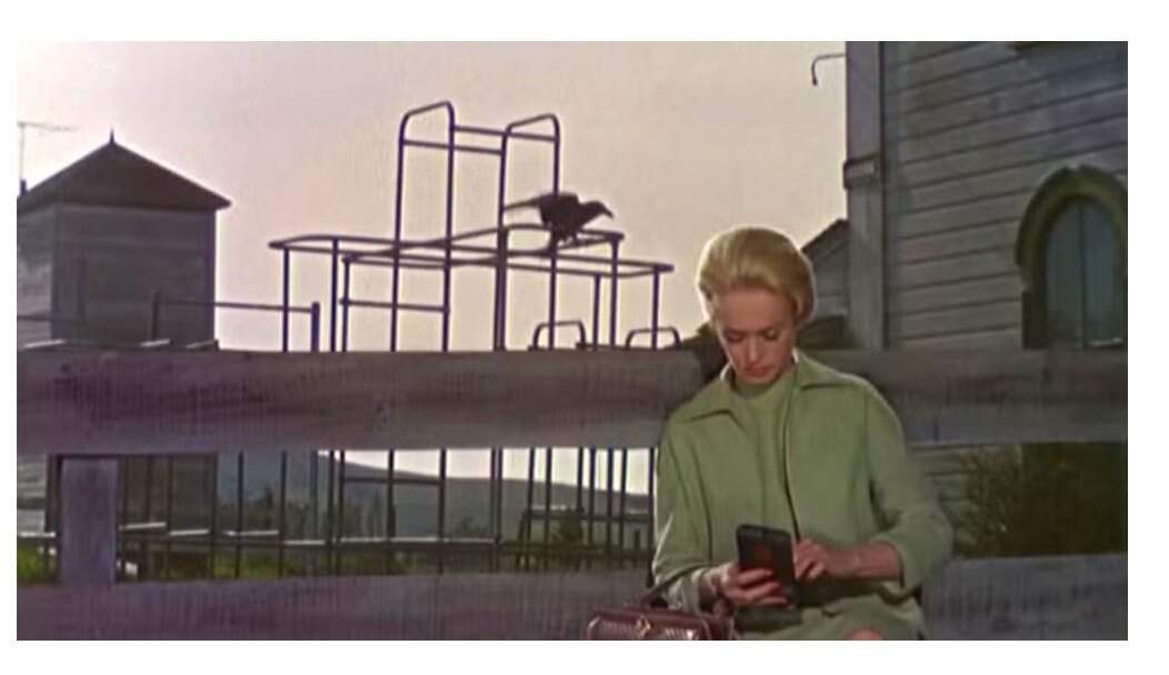 Uma das cenas mais marcantes mostra crianças cantando em uma escola enquanto, do lado de fora, corvos pousam em um trepa-trepa. O acúmulo gradual, quase imperceptível, transforma a paisagem comum em uma imagem aterrorizante. Quando Melanie percebe, o brinquedo já está tomado por aves. O medo nasce não do ataque em si, mas da construção visual que prepara o espectador para o inevitável.