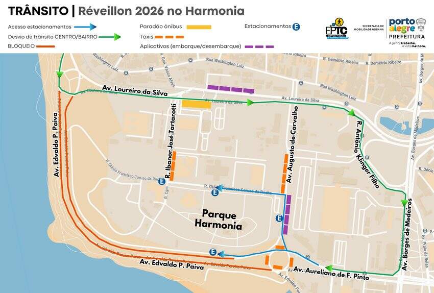 A Empresa Pública de Transporte e Circulação (EPTC) divulga as alterações de trânsito no entorno do Parque Harmonia para a festa de Réveillon 2026. Motoristas e pedestres devem ter atenção em pontos como as avenidas Edvaldo Pereira Paiva e Augusto de Carvalho. Confira abaixo: