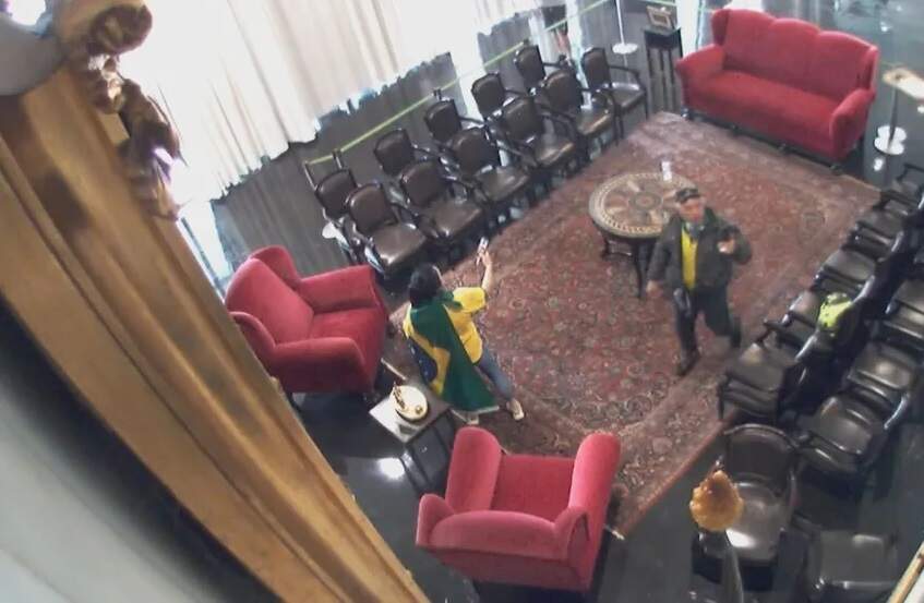 As imagens mostram, ainda, homem se pendurando em uma estátua para entrar no local. A estimativa do Senado é de um prejuízo de mais de R$ 2 milhões com a depredação.