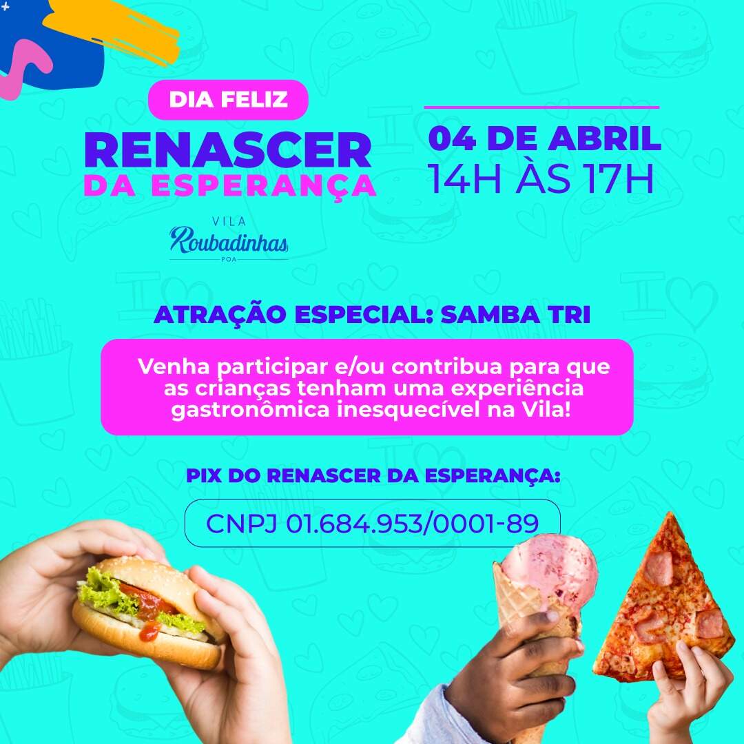 Os jovens atendidos pela ONG Renascer da Esperança terão uma Páscoa diferente e cheia de surpresas em Porto Alegre. Depois das edições realizadas na sede da entidade, na Restinga, nos anos anteriores, o projeto Páscoa Feliz levará cerca de 200 crianças e adolescentes para um evento com música, oficinas, gastronomia e atividades diversas na Vila Roubadinhas, localizada no bairro Auxiliadora.