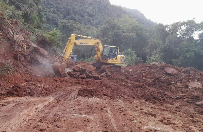ERS-448: em Nova Roma do Sul, com a limpeza emergencial, nesta sexta-feira (17/5) foi possível chegar à ponte metálica. Agora está em execução a limpeza mais ampla e adequada do material deslizado sobre a pista.