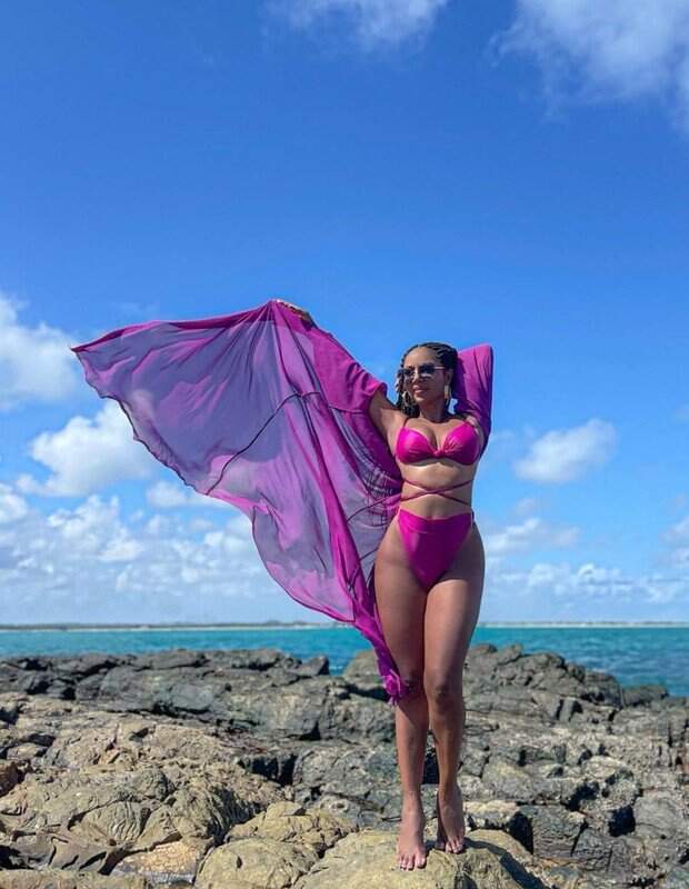 “Sol + Areia + Mar: celebre a combinação perfeita!”, escreveu ela ao curtir a Ilha de Santo Aleixo com um biquíni roxo. Já para aproveitar as belezas da Praia dos Carneiros ela apostou em um maiô preto.