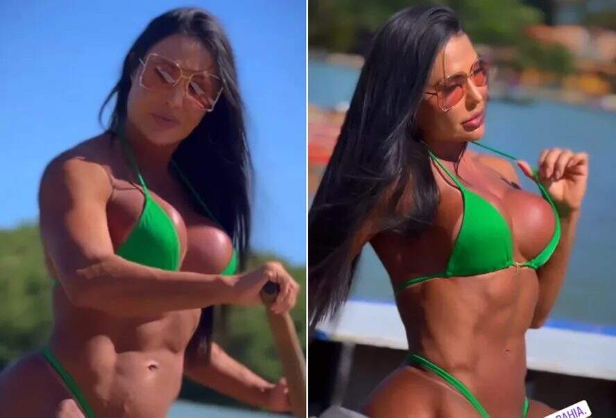 Para o dia de sol forte nas terras baianas, Gracyanne apostou em um biquininho fio-dental verde e posou para fotos dentro do mar, a bordo de um barco.