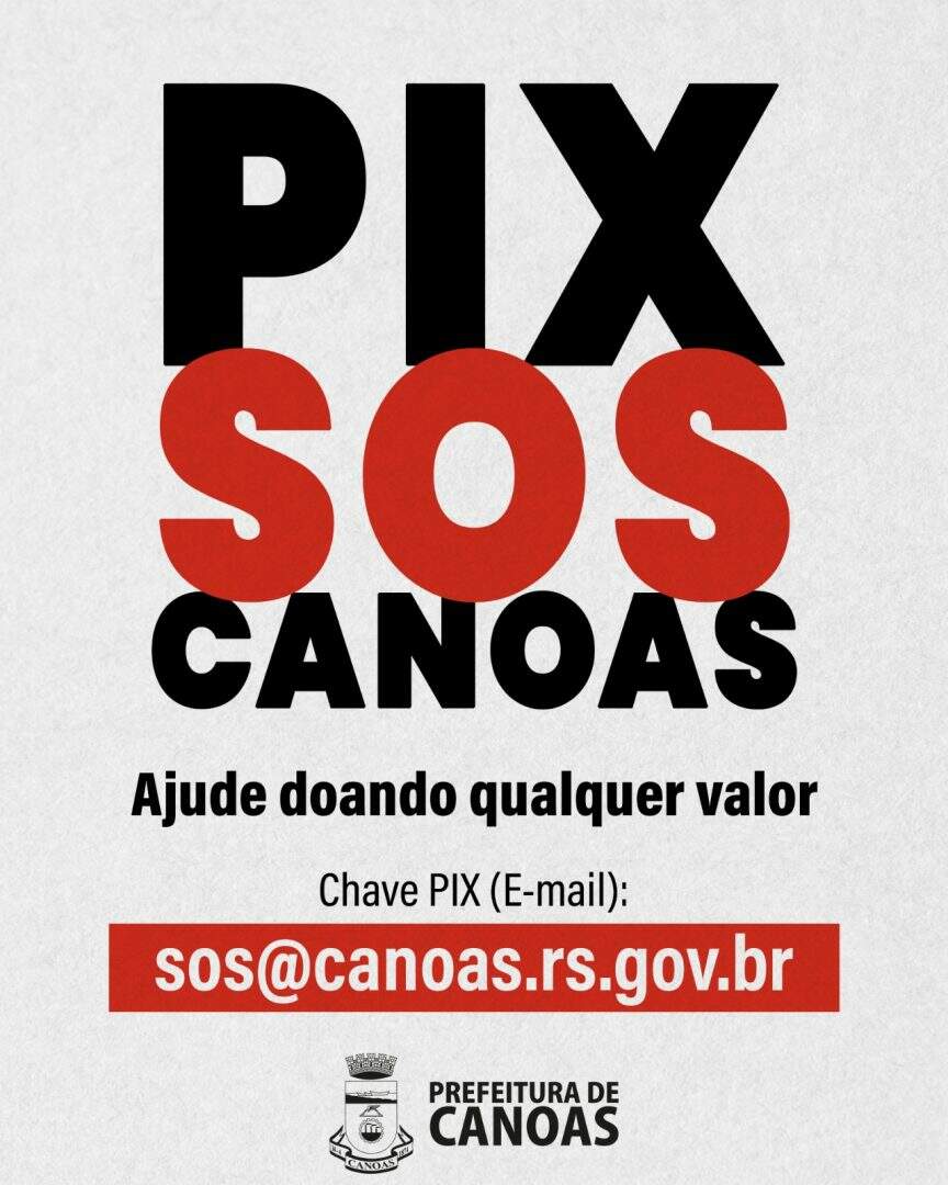 Além das doações de itens essenciais, a ajuda aos atingidos pelas enchentes em Canoas pode ser feita por meio da chave PIX sos@canoas.rs.gov.br, lançada pela prefeitura.