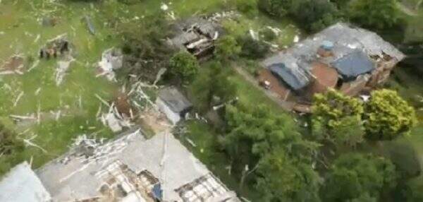 As imagens aéreas do desastre na comunidade de Vila Rica, na zona rural de Farroupilha, mostram que o padrão de danos indica que os destroços foram jogados em diferentes direções, o que caracteriza o fenômeno denominado tornado.