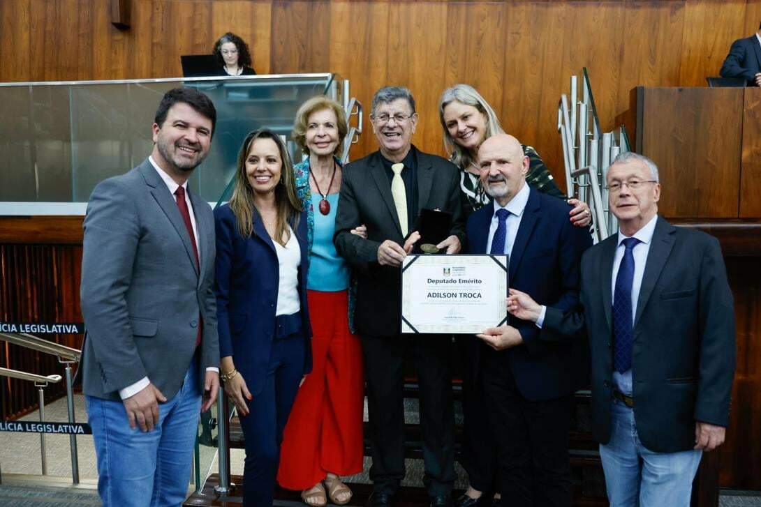 Após as manifestações da tribuna, a deputada Delegada Nadine, ao lado dos deputados Professor Bonatto, Pedro Pereira e Neri, o Carteiro, todos do PSDB, fizeram a entrega do diploma e da Medalha de Deputado Emérito a Adilson Troca.