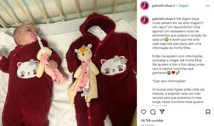 Em busca da filha, Gabrielli vem postando mensagens emocionadas em seu perfil no Instagram.