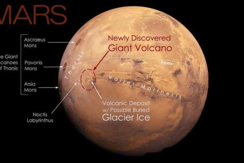 Marte surpreendeu cientistas outra vez. Os cientistas revelaram que descobriram um vulcão gigante e uma possível camada de gelo glacial enterrada na parte leste da província vulcânica Tharsis de Marte, perto da linha do Equador do planeta. A novidade foi divulgada na 55ª Conferência de Ciência Lunar e Planetária realizada em The Woodlands, no Texas, nos Estados Unidos.
