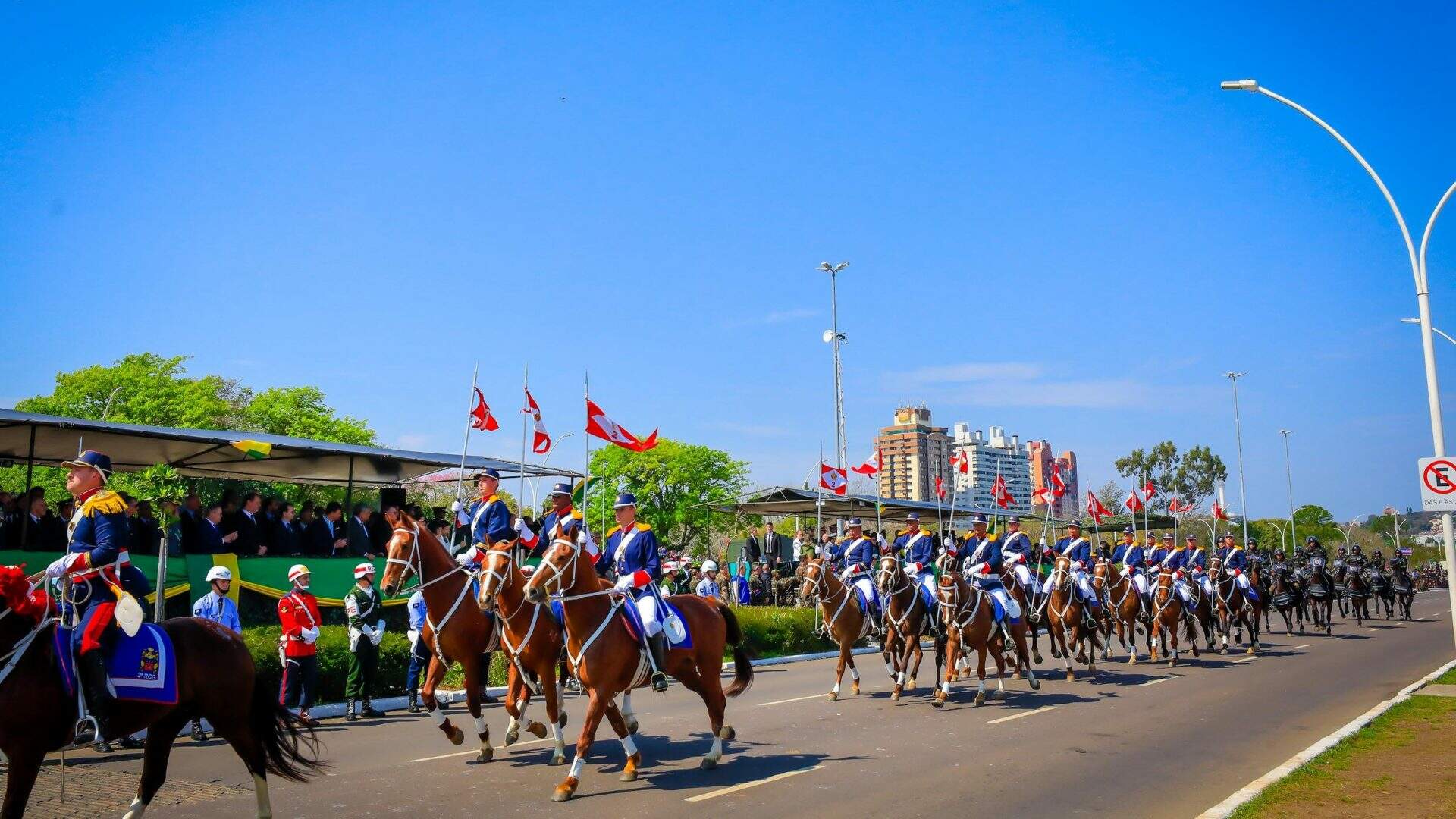 Caças F-5M da FAB cruzaram o céu da capital gaúcha junto de outras aeronaves, como helicópteros da FAB, da Brigada Militar e da Polícia Rodoviária Federal. Na avenida, o desfile motorizado contou com 246 viaturas das forças de segurança. A tropa hipomóvel com 110 cavalos encerrou o evento.