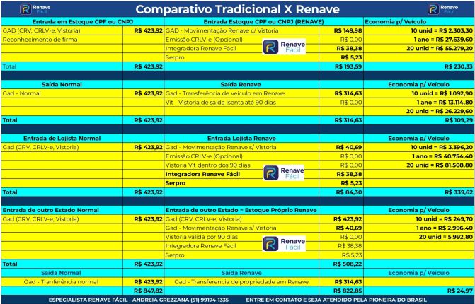 “Se o comprador não tem a estrutura Renave, ele teria que pagar R$423,92, que é a GAD (Guia de Arrecadação Detran) de transferência do CNPJ (Cadastro Nacional da Pessoa Jurídica). […] Só que na estrutura Renave, se a estrutura está dentro de 90 dias e [o veículo] não precisa fazer a vistoria, ele só vai pagar a GAD de R$314”, esclarece.