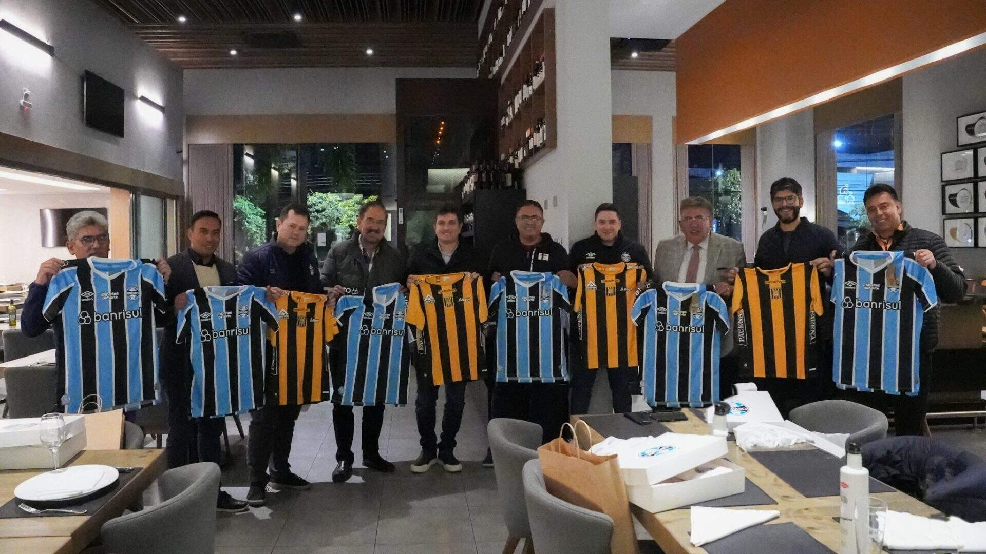 Na noite desta terça-feira (28), às vésperas do jogo entre Grêmio e The Stronges-BOL, pela Libertadores da América, a diretoria gremista recebeu uma comitiva do time boliviano. Representantes dos dois clubes se encontraram para um jantar de confraternização no restaurante Badida Barigui, em Curitiba.