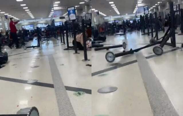 Vídeos publicados nas redes sociais mostram muitas pessoas que se agacharam ao ouvir um disparo e outras correram, derrubando malas em seu caminho e tentando fugir do local.