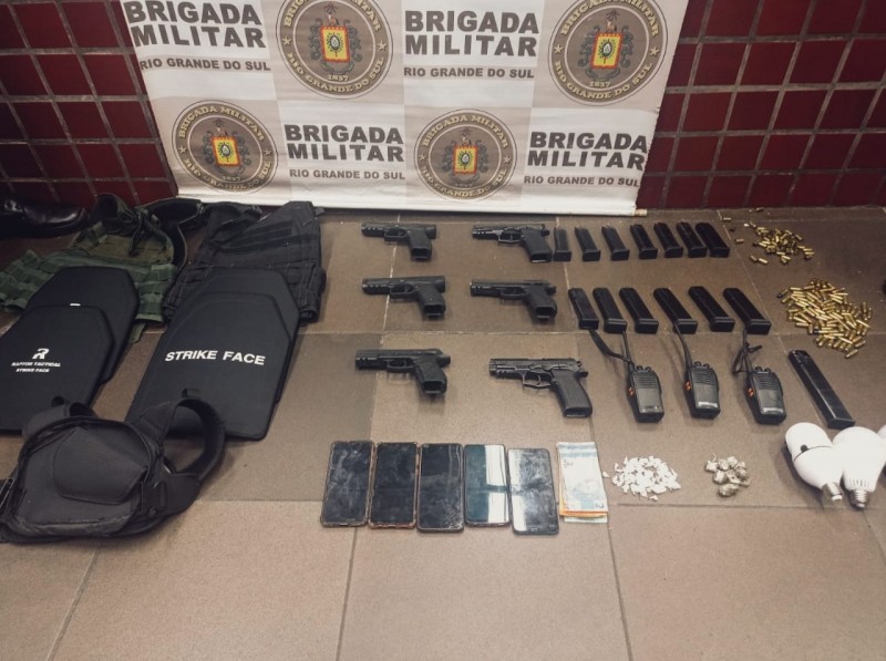 Segundo a BM, os criminosos, atiraram contra os policiais, que revidaram. Com os bandidos, foram apreendidas seis pistolas e munições, além de coletes balísticos, rádios comunicadores, 50 pedras de crack, dez porções de maconha, câmeras de vídeo, cinco telefones celulares e dinheiro.