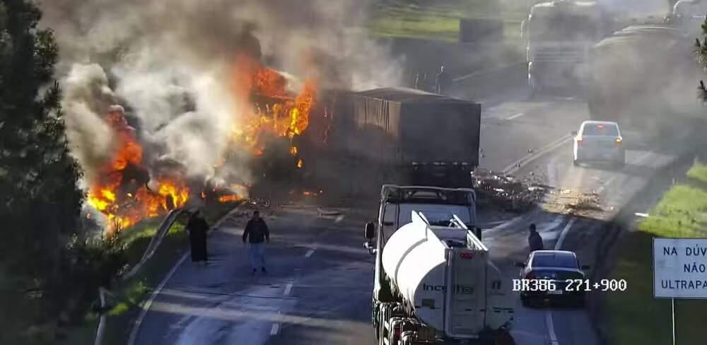 A colisão ocorreu no quilômetro 272 da rodovia e resultou em um incêndio logo após o impacto, bloqueando completamente o trânsito nos dois sentidos. Segundo informações preliminares, um dos caminhões transportava soja e o outro levava uma carga de frutas.