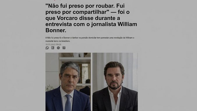 Anúncios em redes sociais como Facebook e Instagram incluem links que direcionam a uma página que imita o portal UOL e exibe uma falsa entrevista, com o seguinte título: “‘Não fui preso por roubar. Fui preso por compartilhar’ – foi o que Vorcaro disse durante a entrevista com o jornalista William Bonner”. O subtítulo afirma: “A visita exclusiva de Bonner a Vorcaro em prisão domiciliar terminou com uma revelação que abalou o sistema financeiro brasileiro”.