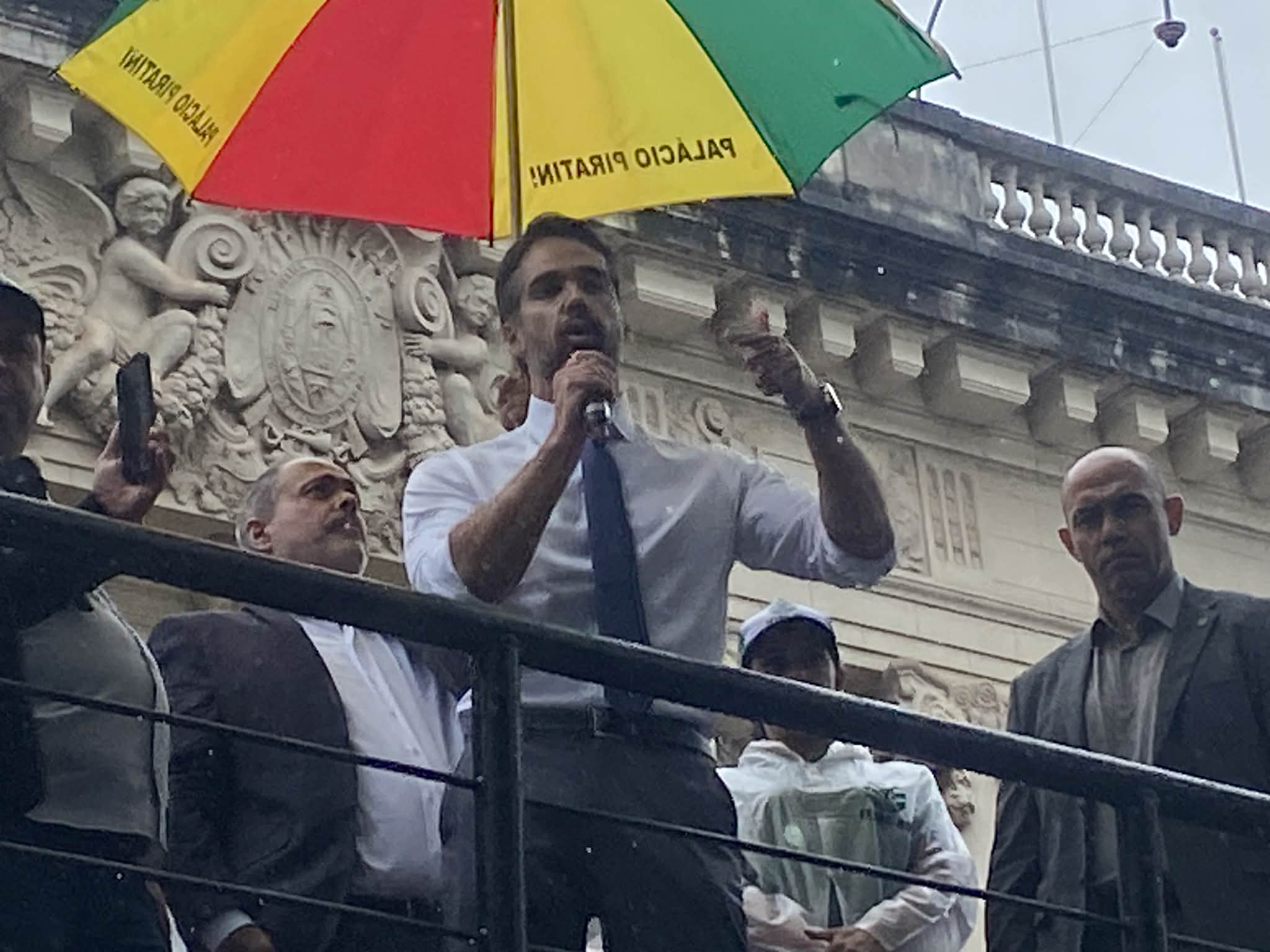 À tarde, o governador Eduardo Leite atravessou a rua do Palácio Piratini e subiu no carro de som onde ocorria uma manifestação organizada pela Federação dos Trabalhadores na Agricultura (Fetag-RS), cobrando solução para a crise que enfrentam.