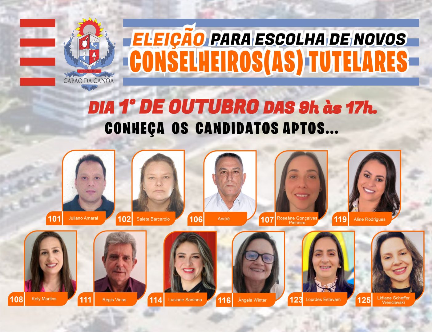 São 11 candidatos que concorrem a 5 vagas para titular e mais 5 suplentes, que tomarão posse no dia 10 de janeiro de 2024. Sua participação é de vital importância para que nossas crianças e adolescentes tenham seus direitos garantidos.