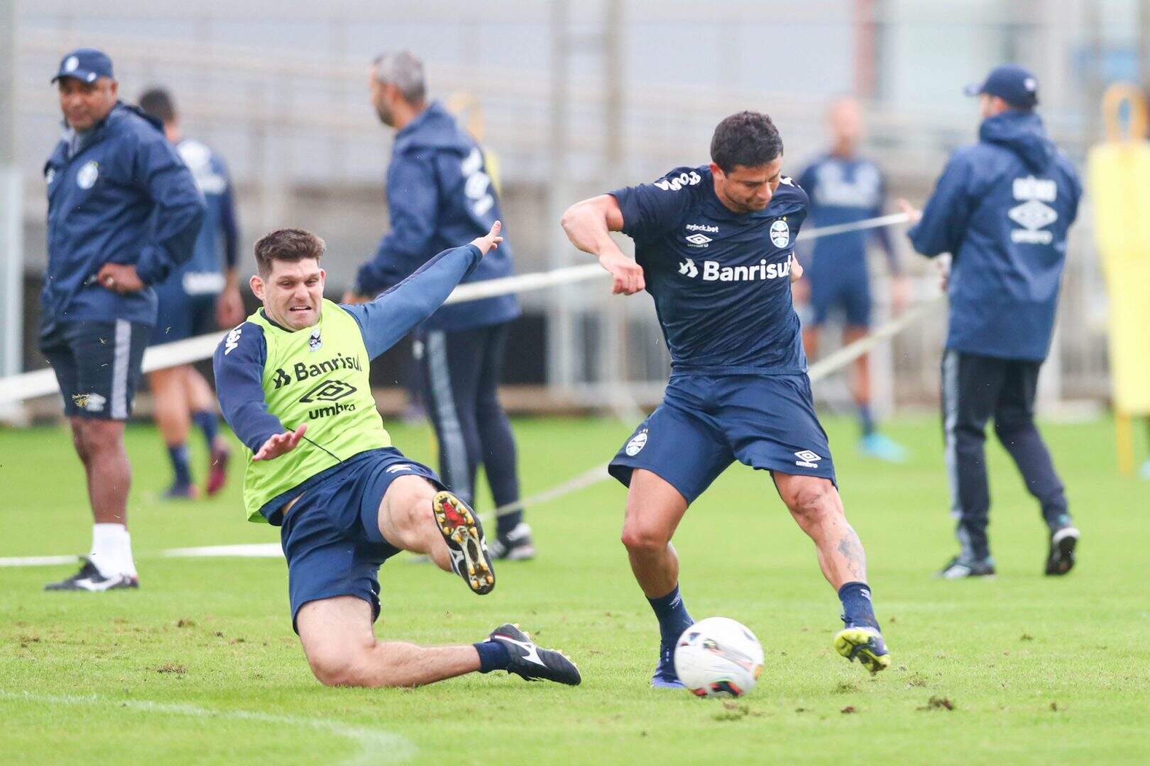 Logo após um aquecimento de velocidade e agilidade entre obstáculos montado pela preparação física do Tricolor, os jogadores do elenco gremista foram para um exercício que consistia na finalização no gol, mas os atletas precisavam superar os defensores antes do chute. Além dessa dificuldade, Roger controlava o tempo para que a jogada fosse concluída. Nesta prática, os goleiros também precisaram trabalharam bastante.