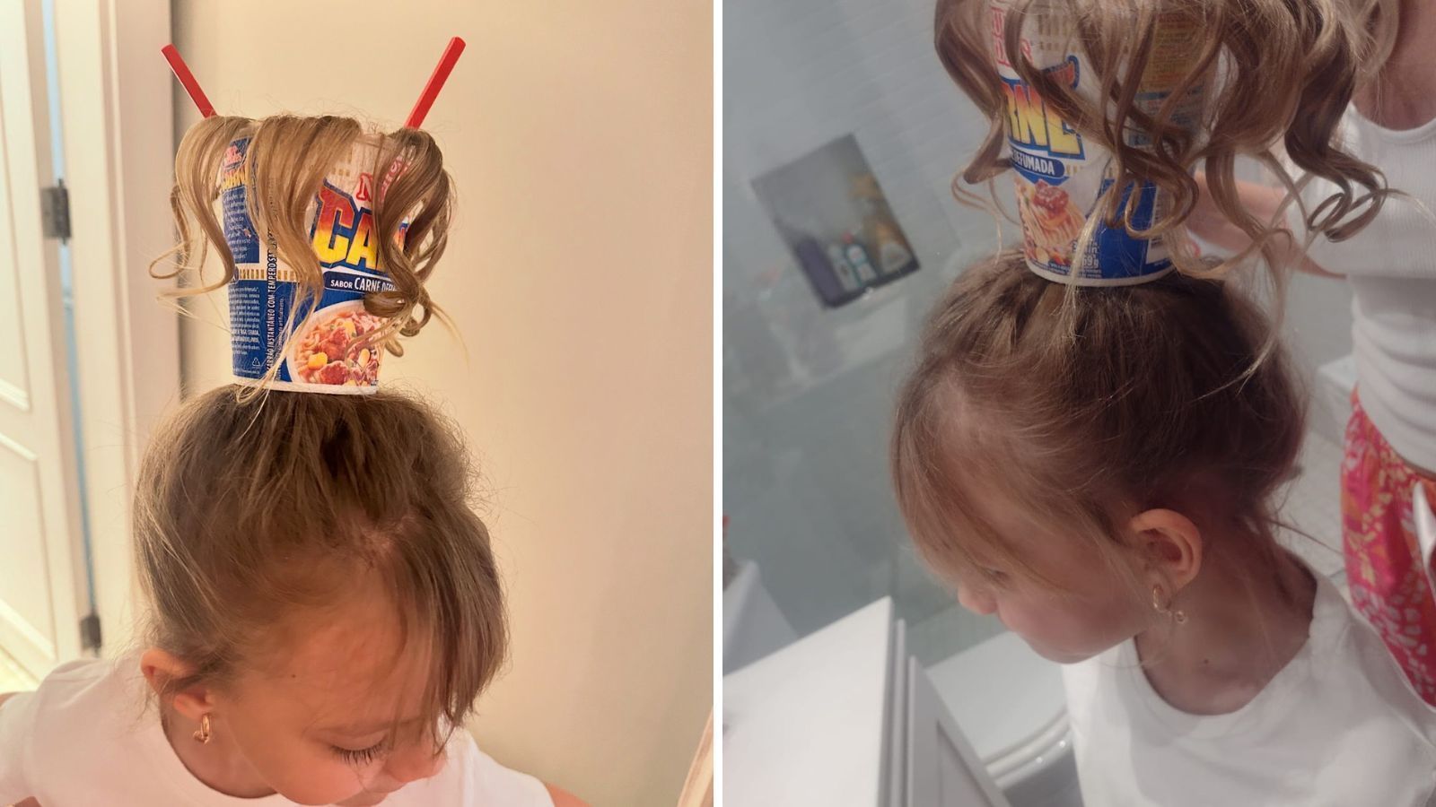 A apresentadora fez com que o cabelo de sua filha Manu, de 7 anos, estivesse saindo de uma caixa de macarrão instantâneo.