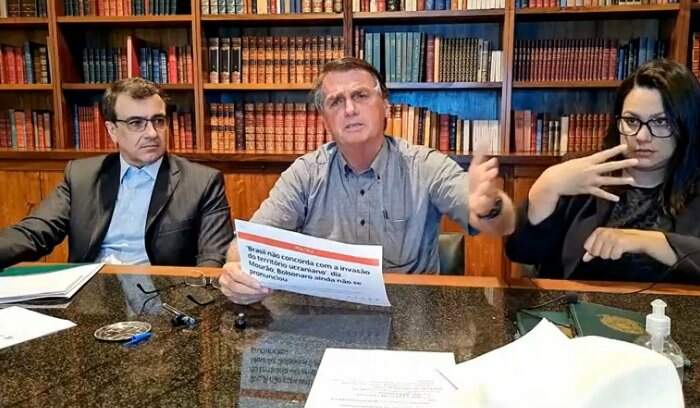 Em transmissão ao vivo por redes sociais ao lado do ministro das Relações Exteriores, Carlos França, Bolsonaro exibiu cópia em papel de uma reportagem que reproduzia declaração do vice-presidente: “Brasil não concorda com a invasão do território ucraniano”.