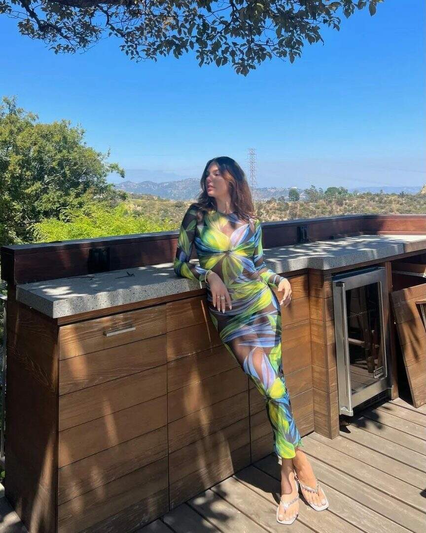 Para os registros, que foram tirados no último domingo (25), a artista escolheu um vestido preto transparente colocado com estampa de folhagem verde e azul. Nas fotos também é possível ver que a atriz está de biquíni por debaixo do look.