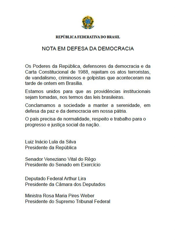 “Estamos unidos para que as providências institucionais sejam tomadas, nos termos das leis brasileiras. Conclamamos a sociedade a manter a serenidade, em defesa da paz e da democracia em nossa Pátria”, diz a nota.
