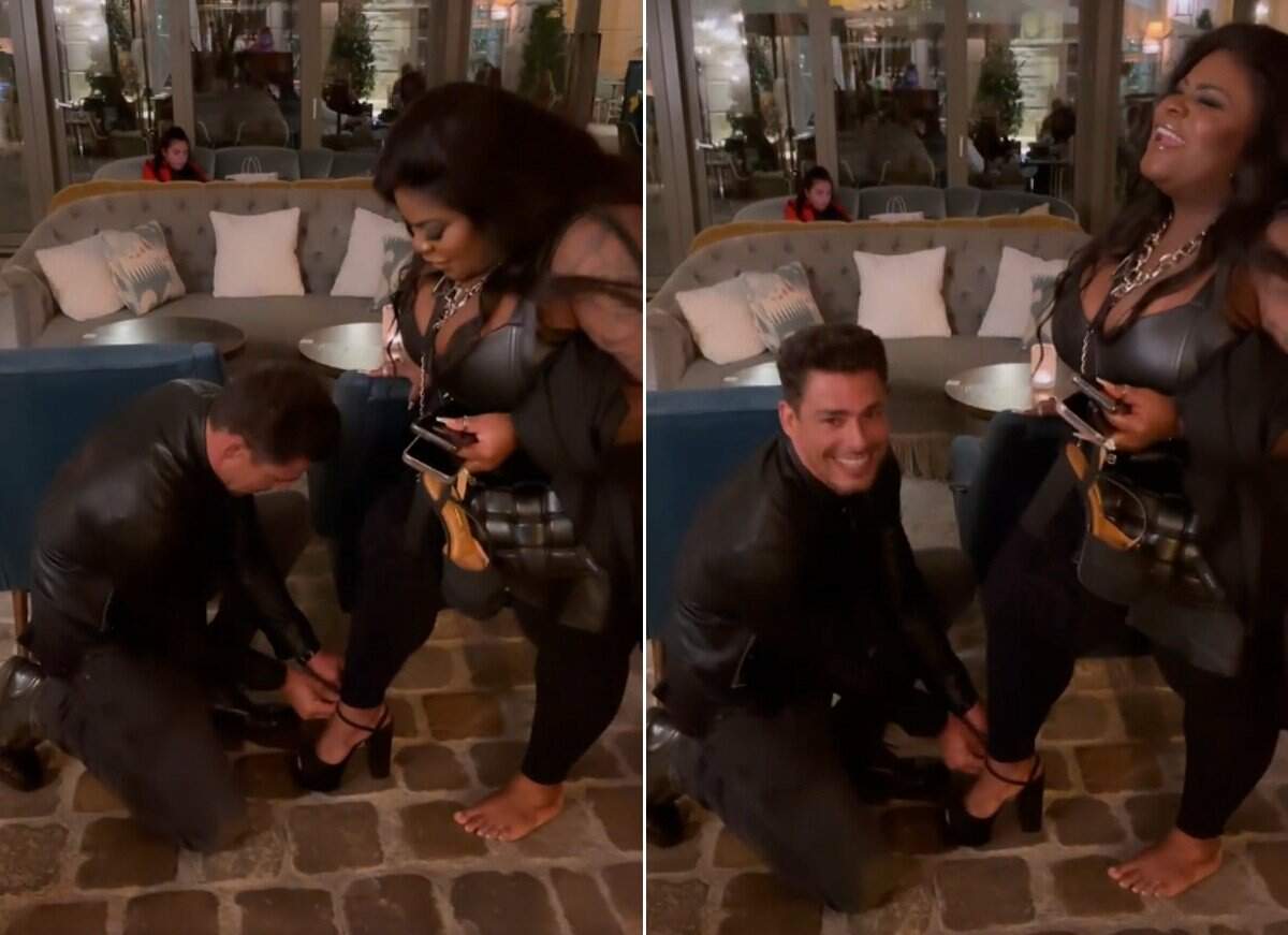 A cantora ainda brincou que teria pegado a sandália na mala do ator e que seria de sua mulher, Mariana Goldfarb. “Por isso não está cabendo, Jojo!”, brincou Danilo Faro, que estava registrando o momento no celular. “Estou até suando!”, disse Cauã, sendo completado por ela. “Eu estou até passando mal”.