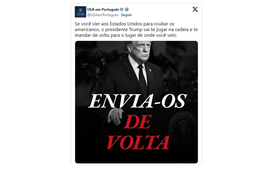 A conta do Departamento de Estado dos Estados Unidos em português no X compartilhouuma ameaça contra turistas e imigrantes. De acordo com a publicação, o presidente Donald Trump “vai jogar na cadeia” quem for ao país para “roubar os americanos”.