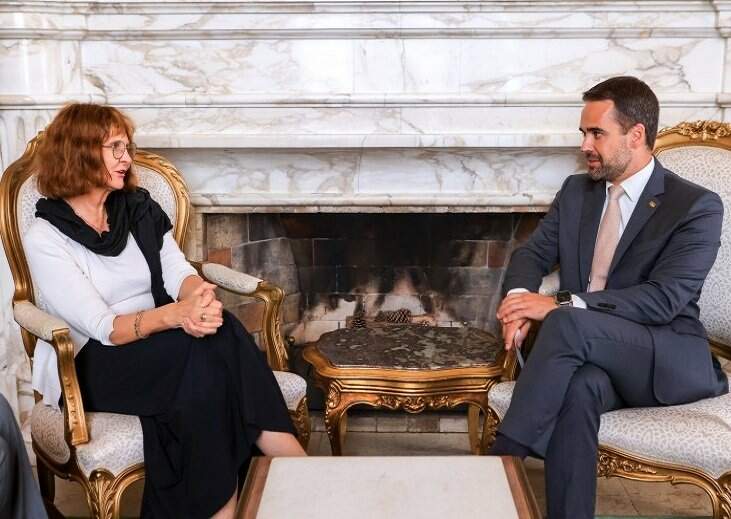O governador gaúcho Eduardo Leite se reuniu nessa terça-feira (16) em Porto Alegre a embaixadora da Alemanha no Brasil, Bettina Cadenbach, em sua primeira visita oficial ao Rio Grande do Sul desde que assumiu o cargo, em setembro. Após uma recepção com honras militares no Palácio Piratini para uma conversa de um hora sobre cooperação em áreas como energia sustentável, inovação, ciência e tecnologia.