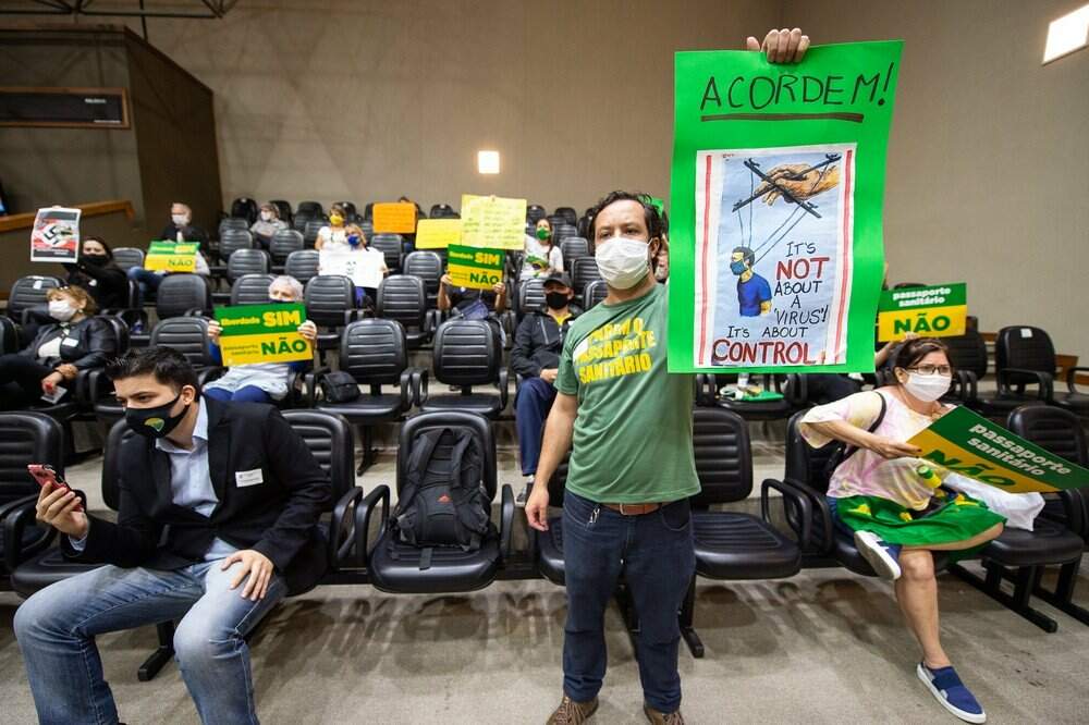 No plenário, uma confusão entre manifestantes contrários ao passaporte vacinal e alguns vereadores se formou. Antes do tumulto no interior da Câmara de Vereadores, um manifestante chegou a exibir cartaz com reprodução de suástica.