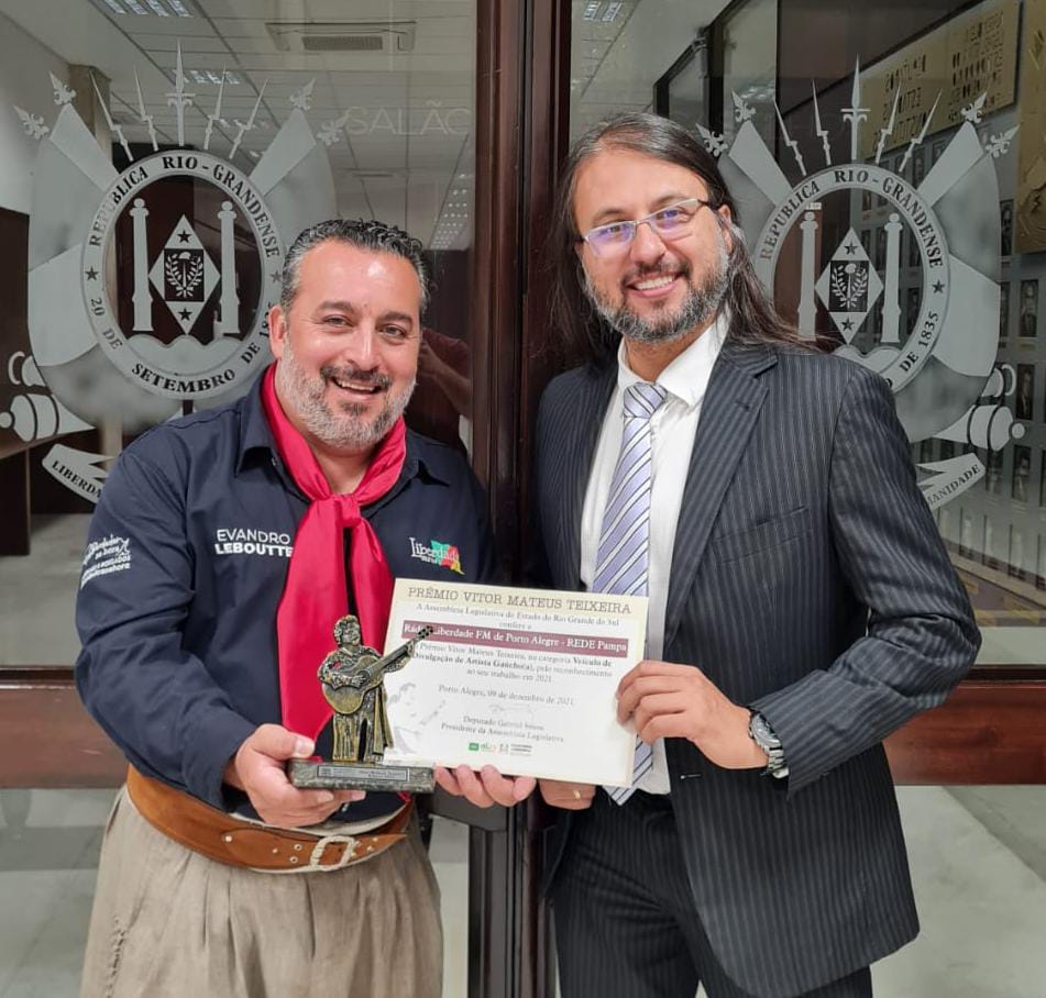 A Rádio Liberdade 83,3 FM e 99,7 FM recebeu na noite de quinta-feira (09), no Teatro Dante Barone da Assembleia Legislativa do Rio Grande do Sul, o Prêmio Vitor Mateus Teixeira 2021, na categoria Veículo de Divulgação de Artista Gaúcho (a).