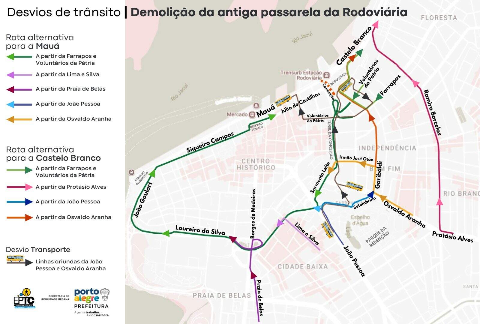 As linhas de ônibus procedentes das avenidas Osvaldo Aranha e João Pessoa, via Paulo Gama, com destino ao Centro, deverão desviar pelo Túnel e Elevada da Conceição até o Largo Vespasiano Júlio Veppo, onde haverá parada provisória em frente à Rodoviária para embarque e desembarque.
