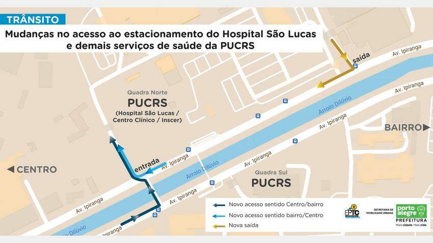 A EPTC (Empresa Pública de Transporte e Circulação) informa que, a partir desta quinta-feira (18), a entrada e saída do estacionamento do Hospital São Lucas da PUCRS, em Porto Alegre, terão seus sentidos invertidos. A mudança facilita o acesso dos motoristas que se deslocam pelo sentido Centro ao bairro.