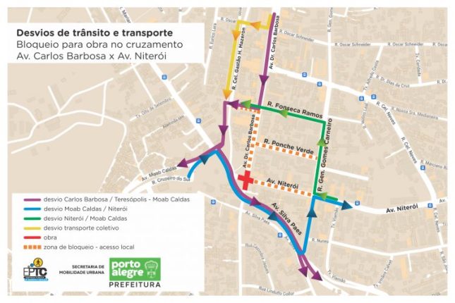 Em razão do avanço nas obras da duplicação da avenida Tronco, a Empresa Pública de Transporte e Circulação (EPTC) informa que a partir das 9h desta segunda-feira (13) o cruzamento da avenida Carlos Barbosa com a avenida Niterói será bloqueado para o trânsito de veículos, por um período de 30 dias.