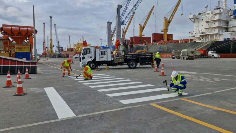 O governo do Estado, por meio da Portos RS, iniciou a execução da manutenção da sinalização na área primária do Porto do Rio Grande. A ação contempla a renovação da sinalização horizontal e vertical, além da instalação de barreiras de concreto, com o objetivo de garantir a segurança e a organização do fluxo de veículos e pedestres que circulam na área portuária.