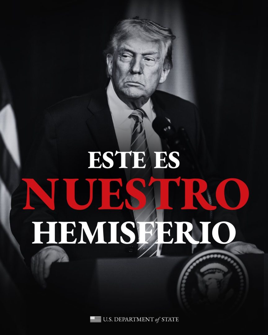 O post traz uma imagem com uma foto do presidente Donald Trump em preto e branco e a frase “Este é nosso hemisfério”, com a palavra “nosso” destacada em vermelho. Um post idêntico foi feito por uma conta do Departamento de Estado em espanhol.