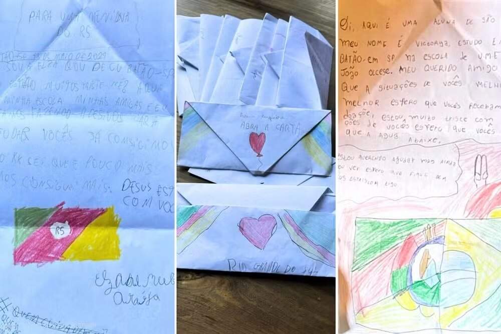Alunos entre 10 e 11 anos de uma escola municipal de Cubatão, em São Paulo, escreveram cartas de solidariedade às vítimas da tragédia do Rio Grande do Sul e as encaminharam junto à doações de mantimentos e roupas. Nos textos, as crianças enviaram palavras de incentivo e carinho aos afetados pelas enchentes. “Estamos de joelhos no chão, com fé”, escreveu uma delas.