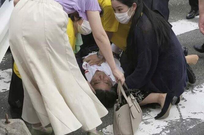 Abe foi atacado durante discurso perto da estação Yamato-Saidaiji, em Nara, e caiu sangrando. Ele estava com as mãos no peito quando caiu e sua camisa estava ensanguentada.