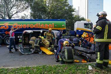 Na tarde desta terça-feira (26), foi realizado um exercício simulado de desastre ao ar livre em Porto Alegre. O cenário da ação contou com um derramamento de óleo diesel (água, em realidade) na via pública, devido à colisão de um carro em um caminhão de combustível.
