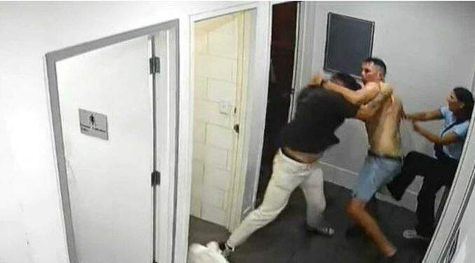 Imagens de câmeras de segurança do local mostram o momento em que o trabalhador bate repetidas vezes na porta do banheiro. Sem resposta, o faxineiro passa a tentar abrir a porta. Tempo depois, um homem sai de dentro do banheiro e ataca o funcionário.
