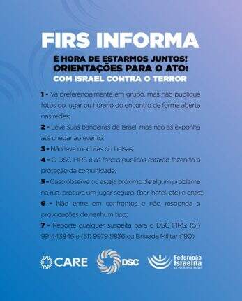 Denominada “Com Israel contra o Terror”, a manifestação ocorreu na Praça Doutor Maurício Cardoso, no bairro Moinhos de Vento. A entidade solicitou que as pessoas comparecessem no ato vestidas de azul e branco.